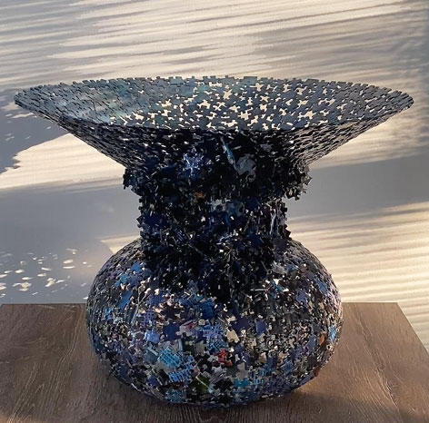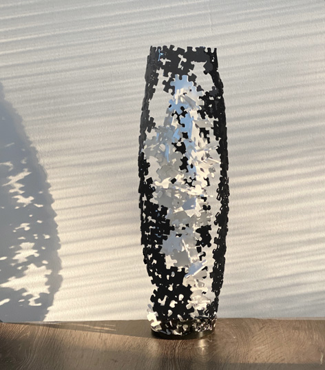 Met de puzzelstukjes sloeg hij meteen aan het stapelen en plakken. Hij maakt vazen, eieren, een